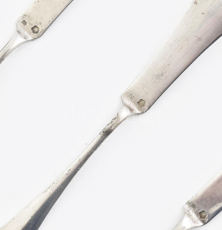 Ezüst (Ag) vajkés, 4 db, jelzett, h: 14 cm, nettó: 65 g https://www.darabanth.com/hu/431-Gyorsarveres/431.0/Nemesfem-disztargyak-ekszerek-dragakovek/Nemesfem-disztargyak-ekszerek-dragakovek~5000027/Ezust-Ag-vajkes-4-db-jelzett-h-14-cm-netto-65-g~II2766592