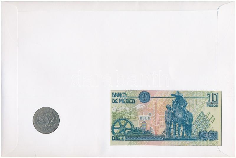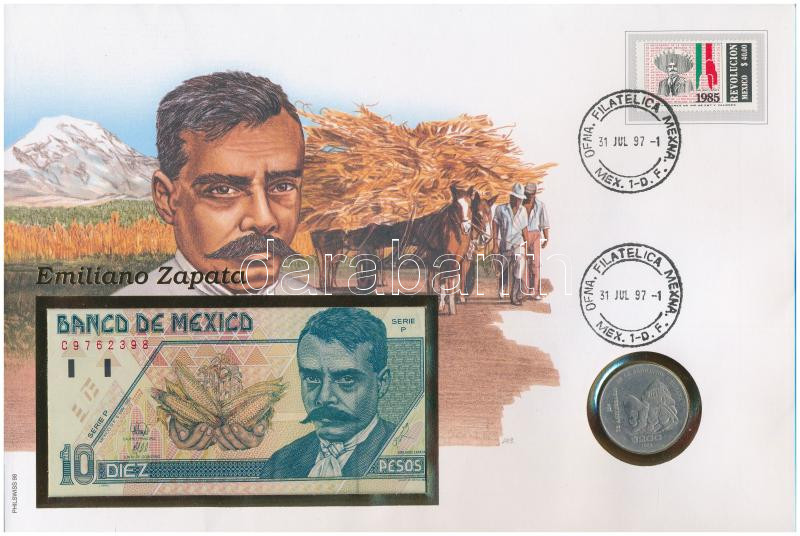 Mexikó "Emiliano Zapata" érmés és bankjegyes felbélyegzett boríték, bélyegzéssel, német nyelvű leírással, benne 1985. 200P Cu-Ni "Az 1910-es forradalom 75. évfordulója" + 1994. 10P T:2, I-
