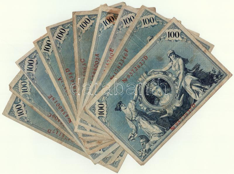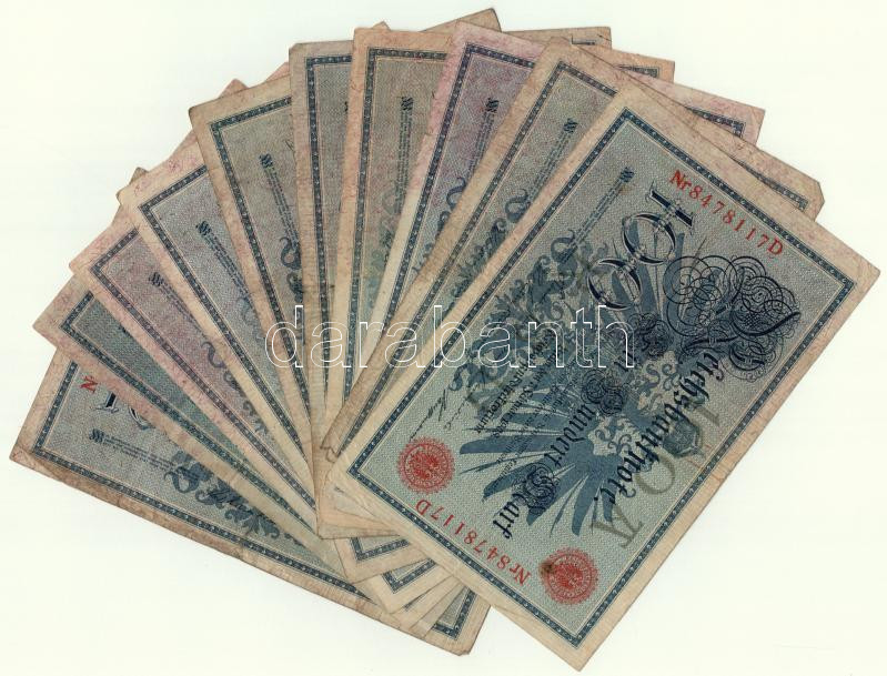 Német Birodalom 1908. 100M piros pecsét (10x) T:III,III- folt German E... https://www.darabanth.com/hu/431-Gyorsarveres/431.0/Numizmatika/Kulfoldi-bankjegyek~1500015/Nemet-Birodalom-1908-100M-piros-pecset-10x-TIII-III-folt-German-Empire-1908-100-Mark-red-sea~II2769563