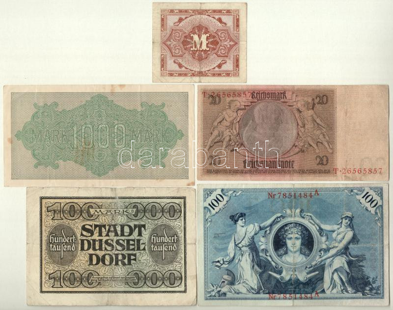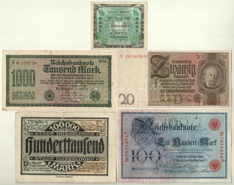 Leírás: Német Birodalom 1908. 100M + 1910. 100M + 1910. 1000M (2xklf) + 1922. 1000M + 1923. 100.000M szükségpénz, Düsseldorf + 1929. 20M + 1945. 1/2M szövetséges megszállás T:III