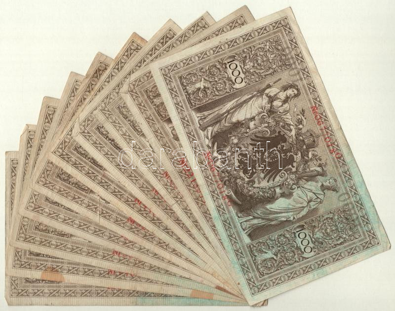 Német Birodalom 1910. 1000M (10x) piros pecsét, hétjegyű sorszámmal T:III folt German Empire 1910. 1000 Mark (10x) with red seal, 7 digit serial C:F spotted Krause#45b