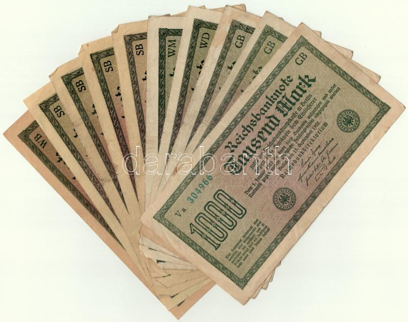 Németország / Weimari Köztársaság 1922. 1000M (10x) 5xklf színű sorszámmal [lila, piros,kék, barna, okker) T:III folt Germany / Weimar Republic 1922. 1000 Mark 6xdiff color of the serial numbers [purple, red, blue, brown, ocher C:F Krause#76 spotted