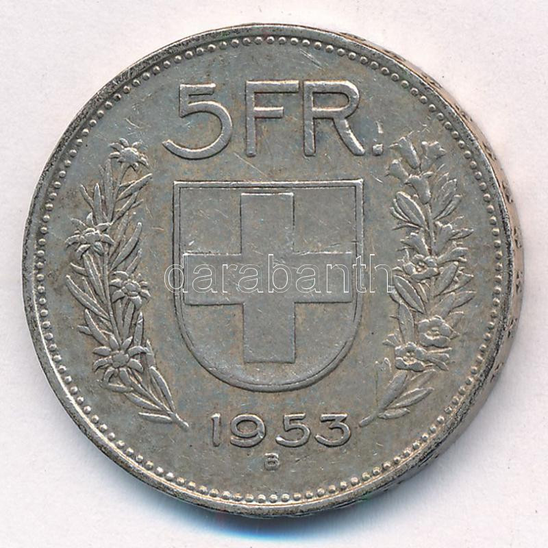 Krause K... https://www.darabanth.com/hu/431-Gyorsarveres/431.0/Numizmatika/Kulfoldi-fem-es-ezustpenzek~1500016/Svajc-1953B-5Fr-Ag-T2--Switzerland-1953B-5-Francs-Ag-CXF--Krause-KM2340~II2769652