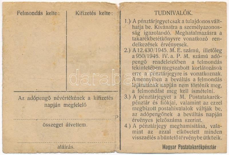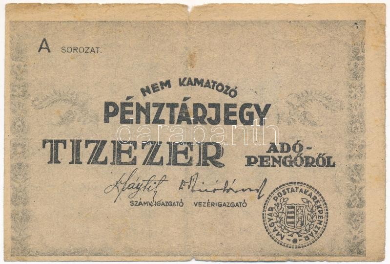 Leírás: 1946. 10.000AP nem kamatozó Pénztárjegy "Másra át nem ruházható", bélyegzés nélkül T:III folt, a fő hajtás mentén két kis anyaghiány