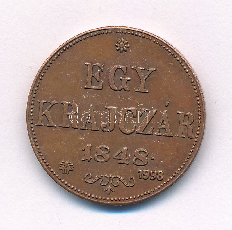 Leírás: 1848KB 1Kr Cu "1998-as jubileumi" utánveret (restrike) T:1-