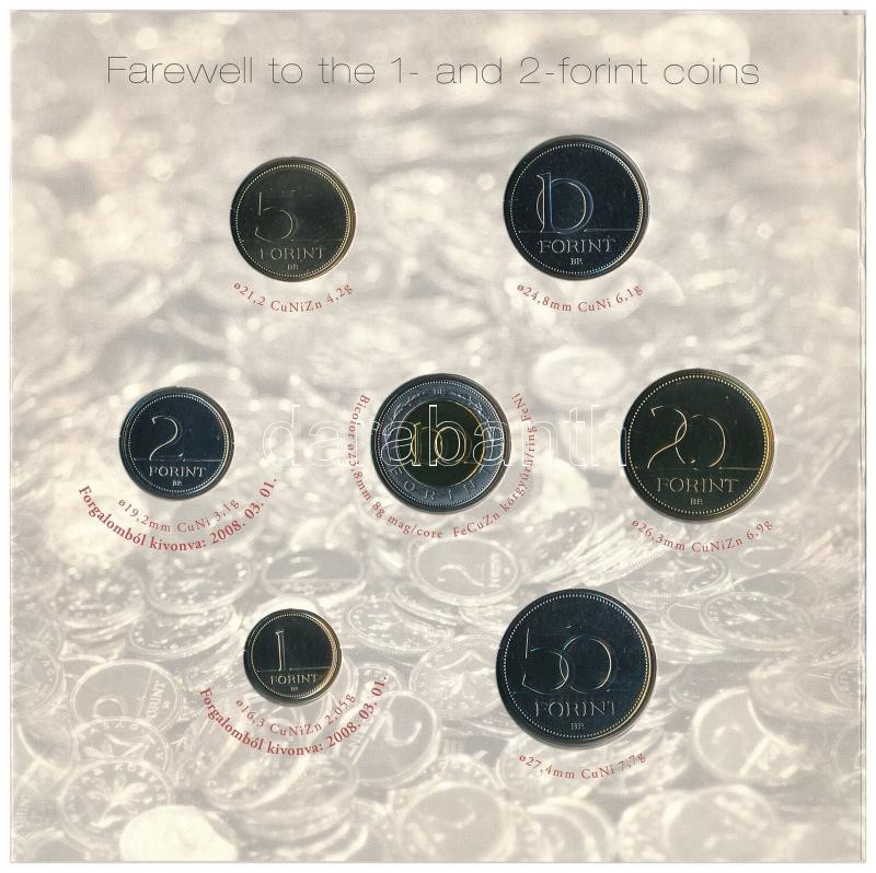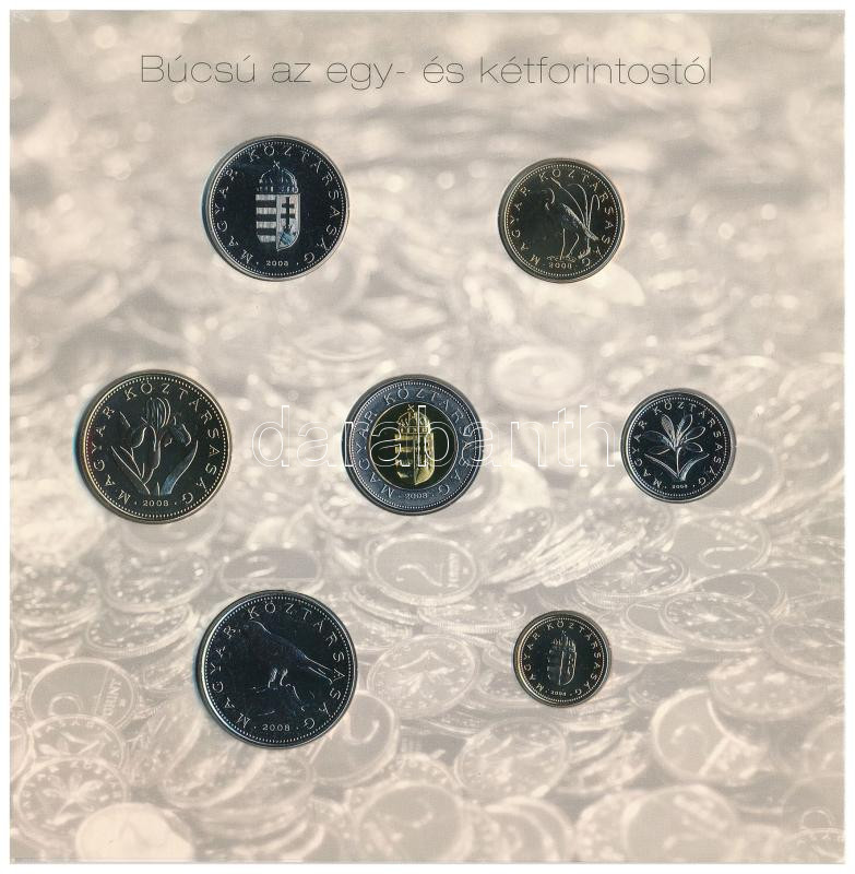 2008. 1Ft-100Ft (7xklf) "Búcsú az egy- és kétforintostól" fo... https://www.darabanth.com/hu/431-Gyorsarveres/431.0/Numizmatika/Magyar-es-magyar-verdejelu-fem-es-ezustpenzek~1500008/2008-1Ft-100Ft-7xklf-Bucsu-az-egy-es-ketforintostol-forgalmi-sor-szettben-TBU-Adamo-FO42~II2769175