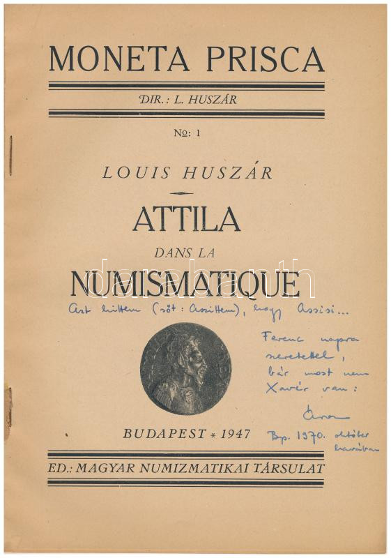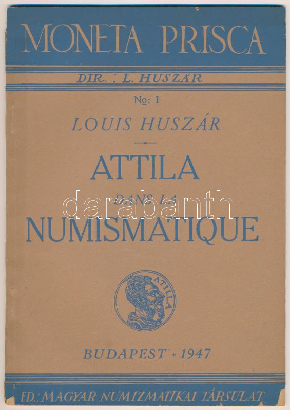Huszár Lajos: Attila dans la Numismatique (Attila a Numizmatikában). Magyar Numizmatikai Társulat, Budapest, 1947. Francia nyelvű tanulmány, gerincen kis sérülés