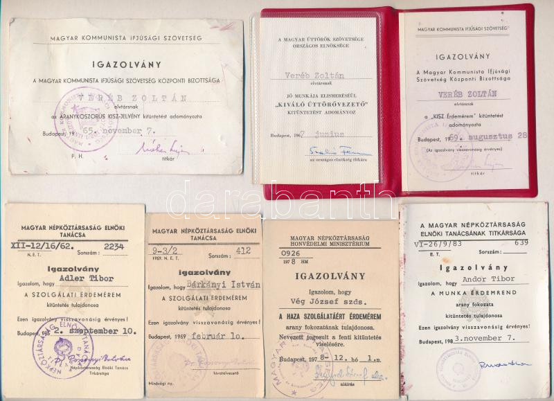 Leírás: 1959-1983. 7db-os vegyes igazolványtétel kitüntetésekhez, egyik műbőr tokban