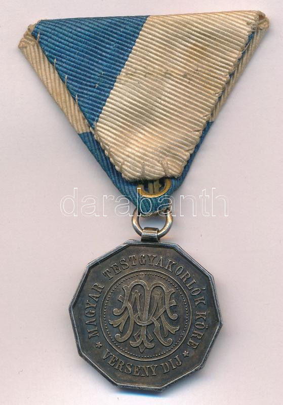 Leírás: ~1910. "Magyar Testgyakorlók Köre Verseny Díj / Bátorság Buzgalom Barátság" kétoldalas jelzett Ag díjérem "S.G.A." gyártói jelzéssel, mellszalagon (11,61g/0.800/30x28mm) T:1- patina