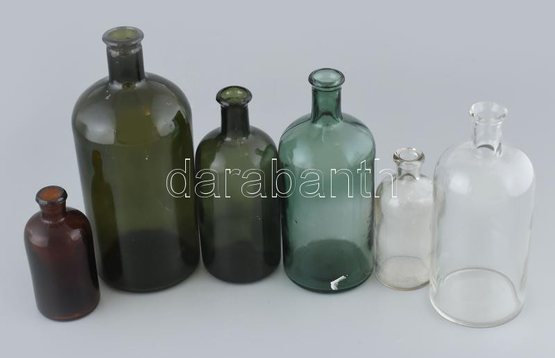 Leírás: 6db orvosságos üvegek, szép állapotban, m: 11,5-22cm