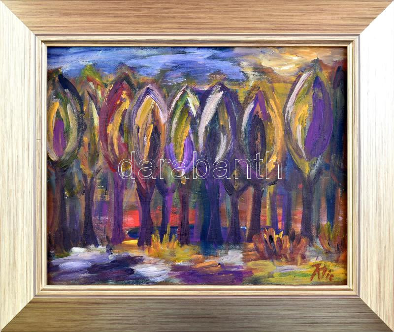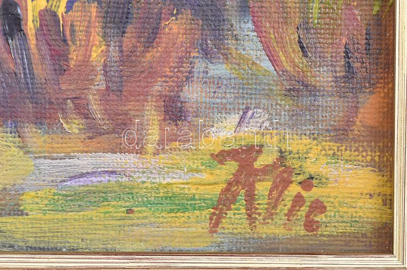 Leírás: Klie jelzéssel: Színes táj. Olaj, karton, dekoratív fakeretben, 24×30 cm