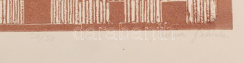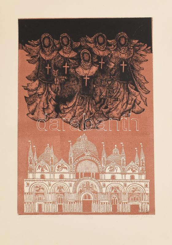 Leírás: Molnár Gabriella (1940-): Apácák a San Marcon. Linómetszet, papír. Jelzett. Számozott: 30/50. Lapszéli sérüléssel. 50x35 cm
