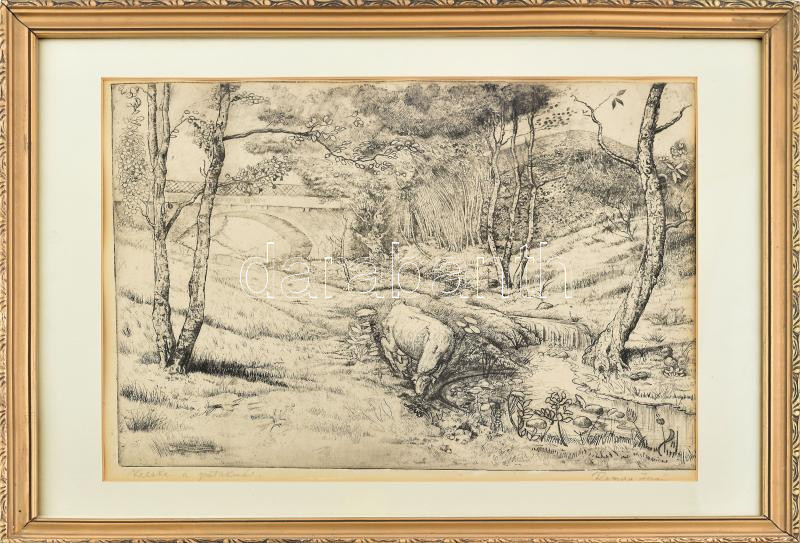 Leírás: Remsey Iván (1921-2006): Kecske a pataknál. Rézkarc, papír, jelzett. Dekoratív üvegezett fakeretben, 29,5x39 cm