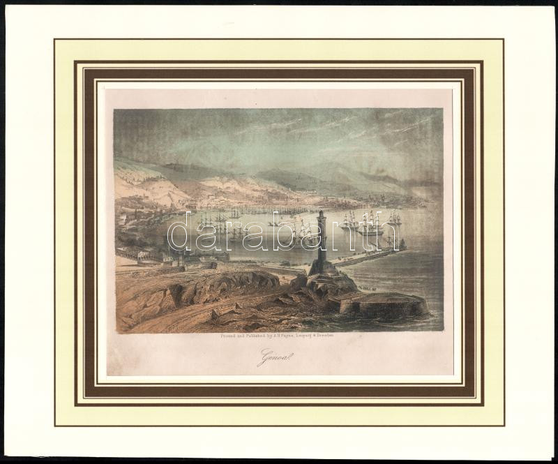 Leírás: Genova látképe hajókkal. Színezett acélmetszet, papír, Albert Henry Payne (1812-1902) nyomása és kiadása. Paszpartuban. 14x21 cm.