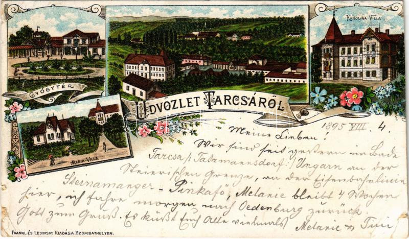 Leírás: 1895 (Vorläufer!!!) Tarcsa, Tarcsafürdő, Bad Tatzmannsdorf; Gyógytér, Mária villa, Karolina villa. Frankl és Ledofsky kiadása / spa, square, villas. Art Nouveau, floral, litho (szakadások / tears)