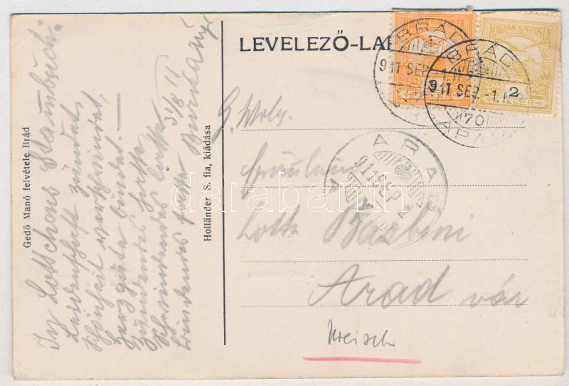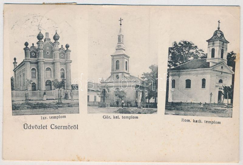1911 Csermő, Cermei; Izraelita templom, zsinagóga, Görögkeleti (ortodox) templom, Római katolikus templom. Gedő Manó felvétele (Brád), Holländer S. fia kiadása / synagogue, Orthodox church, Catholic church (EK)