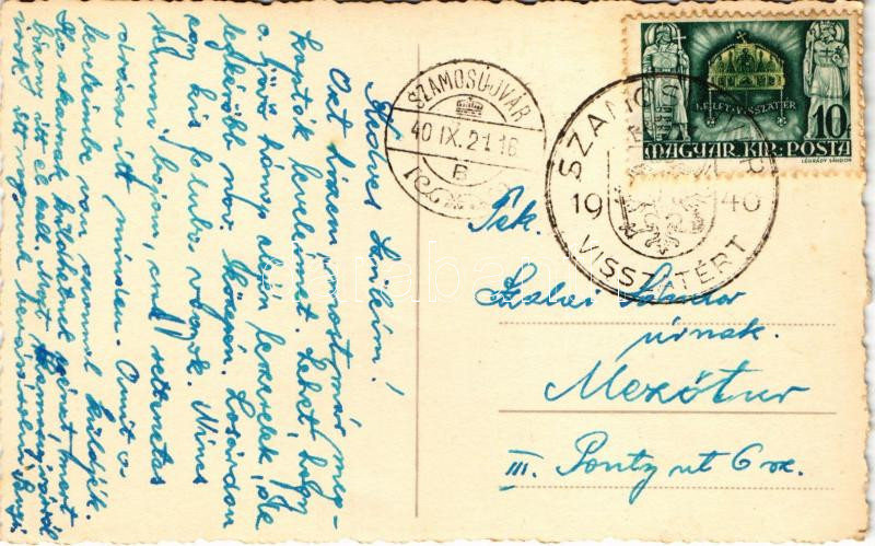 Leírás: 1940 Szamosújvár, Gherla; Sétatér, híd / promenade, bridge. photo + "1940 Szamosújvár visszatért" So. Stpl.