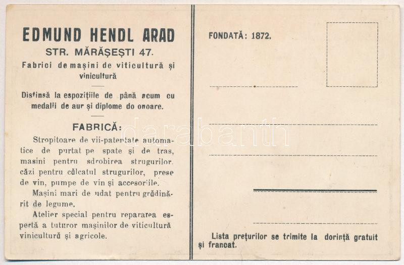 Arad, Hendl Ödön gépgyár reklámlapja. Szőlészeti és borászati gépek. Alapíttatott 1872. Bruchsteiner és Fia / Fabrici de masini de viticultura si vinicultura Edmund Hendl Arad, Str. Marasesti 47. / machine factory advertisement card, viticulture and winemaking machinery. litho