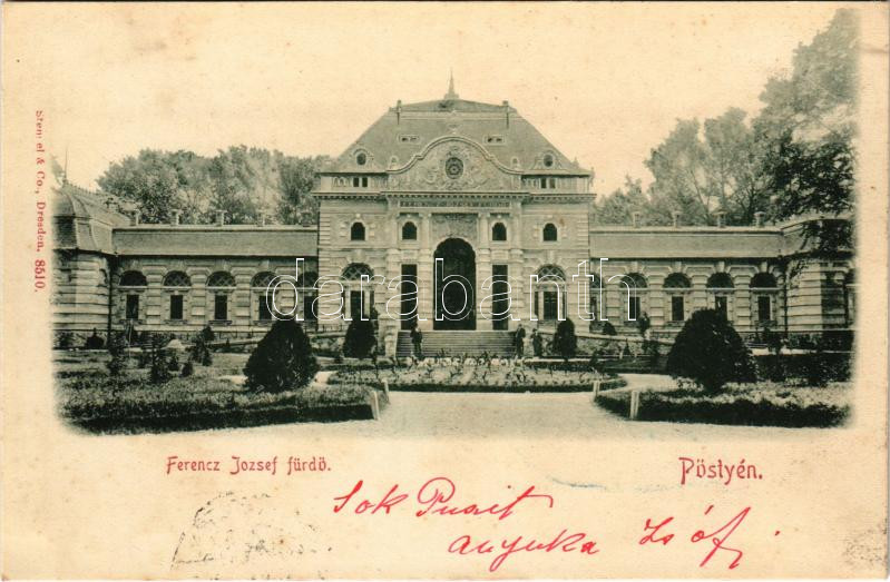 Leírás: 1899 (Vorläufer) Pöstyén, Pistyan, Piestany; Ferencz József fürdő / spa, bathhouse (fl)