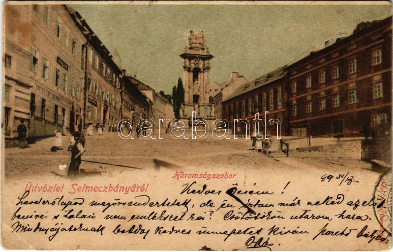 1899 (Vorläufer) Selmecbánya, Schemnitz, Banská Stiavnica; Szentháromság szobor, bor és sörcsarnok. Joerges kiadása / street view, Holy Trinity statue, inn, beer hall (Rb)