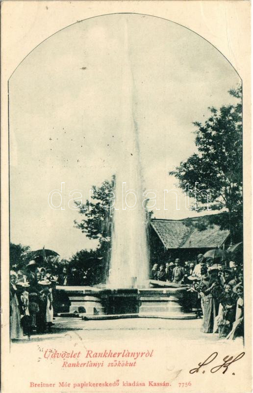 Leírás: 1900 Ránkfüred, Rank-Herlány, Ránkherlány, Rank Herlein, Herlany (Kassa, Kosice, Kaschau); Ránki szökőforrás, gejzír. Breitner Mór kiadása / Herliansky geyzír / geyser, fountain, spa (EB)