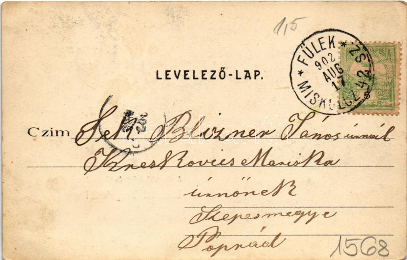 Leírás: 1902 Várgede, Várgedefürdő, Kúpele Hodejov, Hodejov; Gyógy- és gőzfürdő, Csevicze kút, vonat a háttérben. Kohn Albert kiadása / spa, steam bath, well, spring source, train in the background + "MISKOLCZ - FÜLEK 42. SZ." vasúti mozgóposta bélyegző (EK)