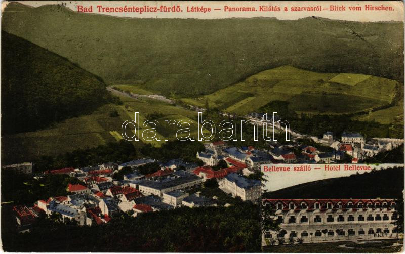 1916 Trencsénteplic, Trencianske Teplice; látkép, kilátás a Szarvasról, Hotel Bellevue szálloda / Panorama, Blick vom Hirschen, Hotel Bellevue / general view, hotel, spa (EK)