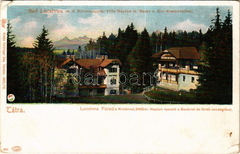 Lucsivna, Lautschburg, Lucivná (Magas-Tátra, Vysoké Tatry); Lucsivnafüred a Krivánnal, Neptun nyaraló a Bazárral és fürdő vendéglővel, étterem. Feitzinger Ede 1902/12. 401. Auto-Chrom / Bad Lucsivna m. d. Krivan, Villa Neptun m. Bazar u. Kur-Restauration / spa resort, hotel, villa, bazaar shop, restaurant (EK)