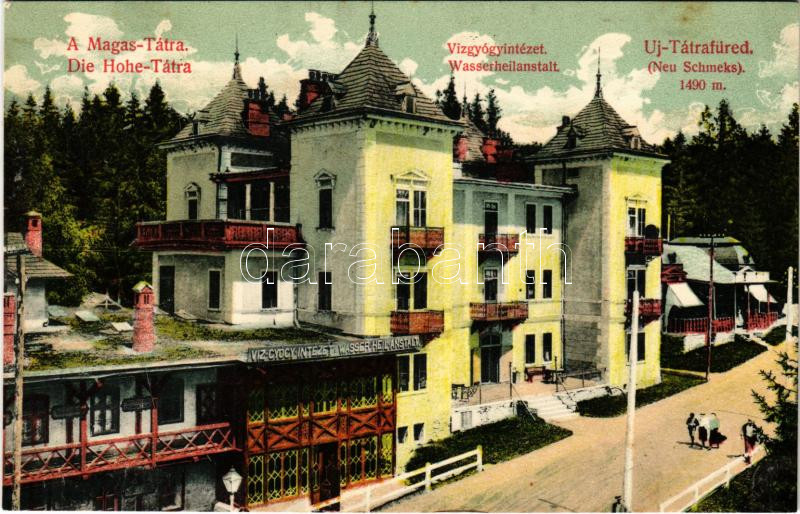 Leírás: Újtátrafüred, Neu-Schmecks, Novy Smokovec (Magas-Tátra, Vysoké Tatry); Vízgyógyintézet. 1490-1907 Divald Károly / Wasser Heilanstalt / spa