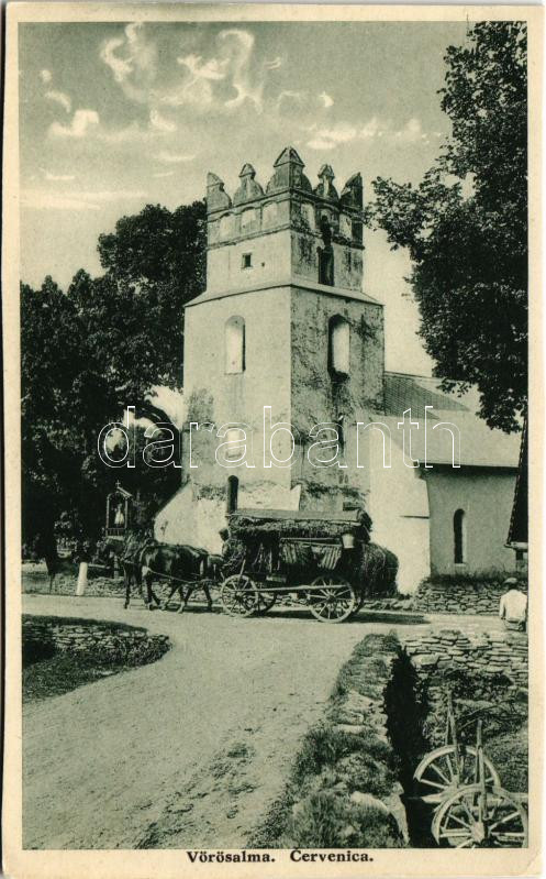 Leírás: Vörösalma, Cervenica pri Sabinove; templom, lovaskocsi / church, horse cart (vágott / cut)