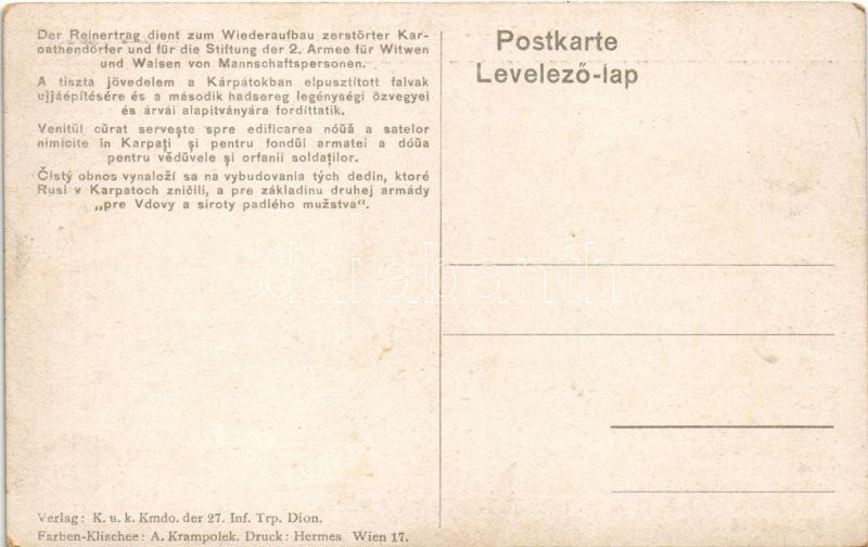 K.u.k. Inft-Regt. Edler von Pokorny Nr. 25.. Weltkrieg 1914-1916. Farben-Klischee A. Krampolek. Verlag K.u.k. Kmdo. der 27. Inf. Trp. Dion. / A tiszta jövedelem a Kárpátokban elpusztÃtott falvak újjáépÃtésére és a második hadsereg legénységi özvegyei és árvái alapÃtványra fordÃttatik / WWI Austro-Hungarian military art s: Hans Larwin