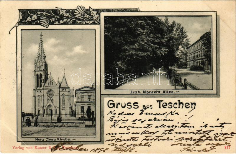 Leírás: 1898 (Vorläufer) Cieszyn, Teschen; Herz Jesu Kirche, Erzherzog Albrecht Allee / church, street view. Verlag von Kutzer & Co. Art Nouveau, floral (EK)
