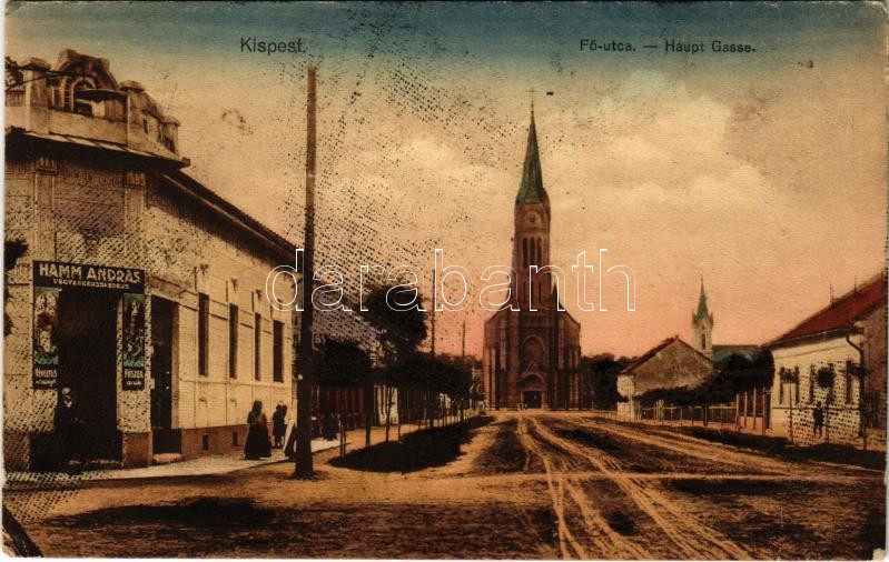 1914 Budapest XIX. Kispest, Fő utca, Hamm András üzlete, templom (EK) https://www.darabanth.com/hu/432-Gyorsarveres/432.0/Kepeslapok/Magyarorszag~2000005/1914-Budapest-XIX-Kispest-Fo-utca-Hamm-Andras-uzlete-templom-EK~II2782392