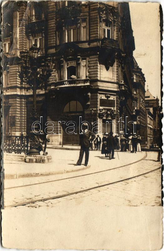 Budapest V. Gerstner József egyenruha készítő üzlete a Ferenc József rakpart 27. szám alatt (ma Belgrád rakpart és Irányi utca sarok), nyomdafesték, villamossín. photo (fa)