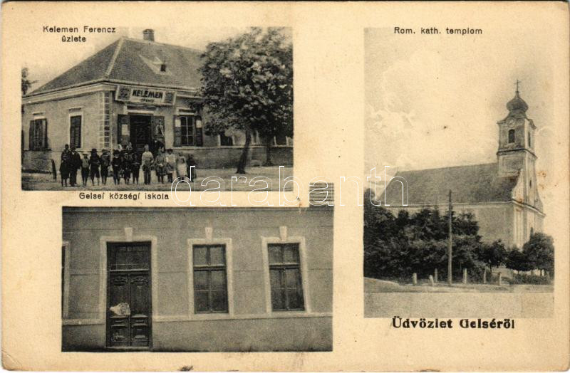 Gelse, Római katolikus templom, Községi iskola, Kelemen Ferenc üzlete.... https://www.darabanth.com/hu/432-Gyorsarveres/432.0/Kepeslapok/Magyarorszag~2000005/Gelse-Romai-katolikus-templom-Kozsegi-iskola-Kelemen-Ferenc-uzlete-Kalman-fenyirda-EK~II2784387