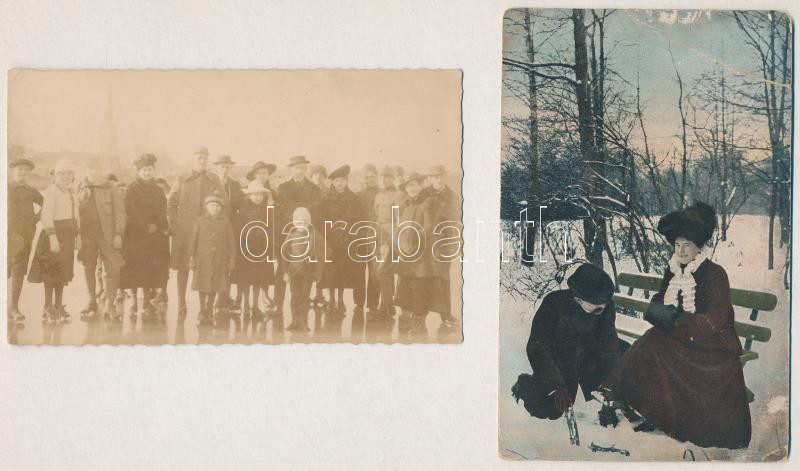 Leírás: 4 db régi téli sport motívum képeslap és fotó: jégkorcsolya, korcsolyázók / 4 pre-1945 winter sport motive postcards and photos: ice skate