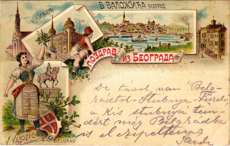 Leírás: Belgrade, Belgrád, Beograd; Greetings... Serbian folklore. V. Valozic Buchhandlung Art Nouveau, floral, litho with coat of arms (Rb)