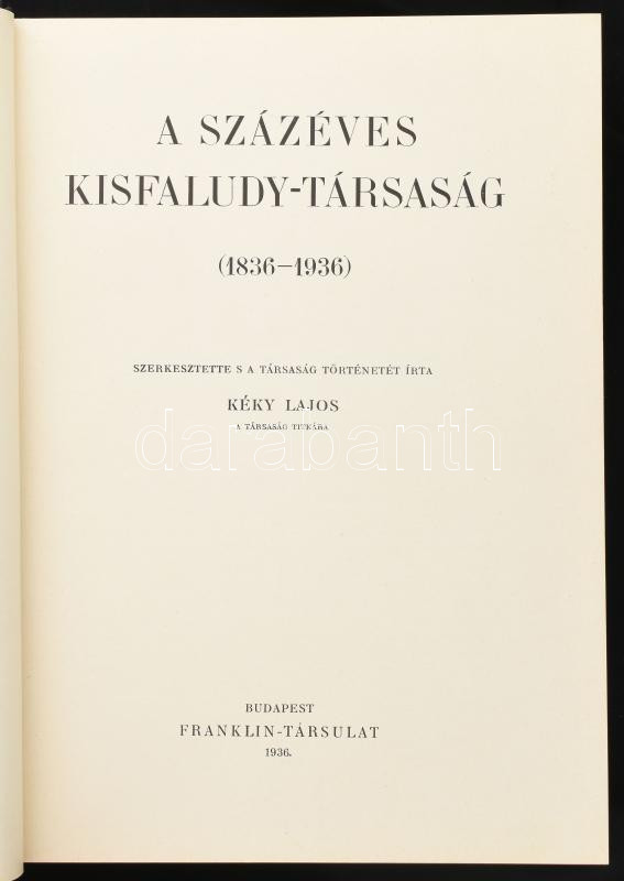 A százéves Kisfaludy-Társaság (1836 - 1936) Szerkesztette s a társaság történetét írta Kéky Lajos. Bp., 1936, Franklin-Társulat, 512 p. Kiadói aranyozott egészvászon-kötésben, kis kopásnyomokkal.