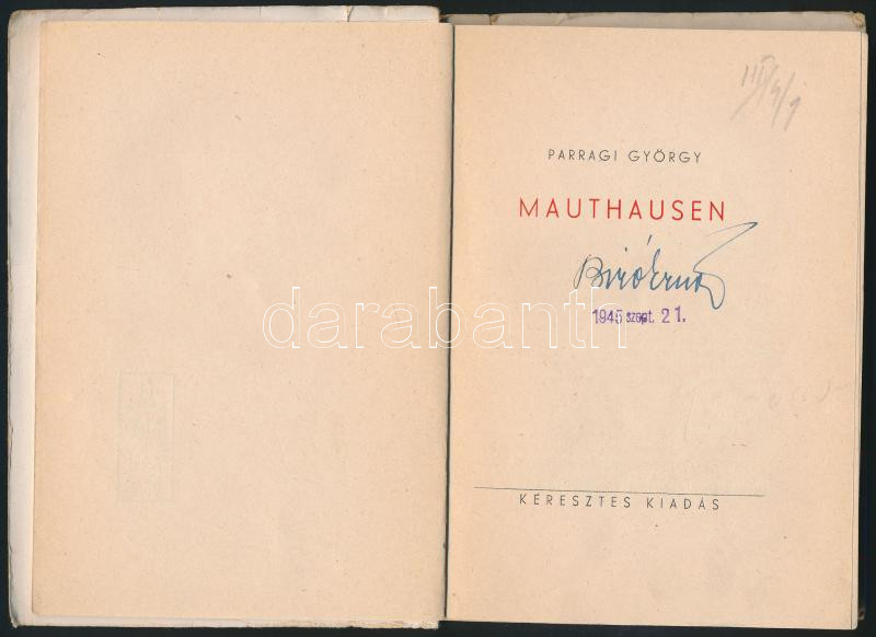 Parragi György: Mauthausen. Bp., 1945, Keresztes. Kiadói papírkötés, t... https://www.darabanth.com/hu/432-Gyorsarveres/432.0/Konyvek/Konyvek-Egyeb-ritkasagok~1000037/Parragi-Gyorgy-Mauthausen-Bp-1945-Keresztes-Kiadoi-papirkotes-tulajdonosi-bejegyzessel-~II2781548