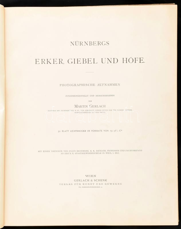Leírás: Gerlach, Martin: Nürnbergs Erker, Giebel und Höfe. Photographische Aufnahmen. Vorwort von Julius Deininger. Wien, é.n. (cca 1890-1900), Gerlach & Schenk, 2 sztl. lev. + 50 t. (fénynyomatok). Egészoldalas, fekete-fehér képekkel. Német nyelven. Kiadói egészvászon-kötés.