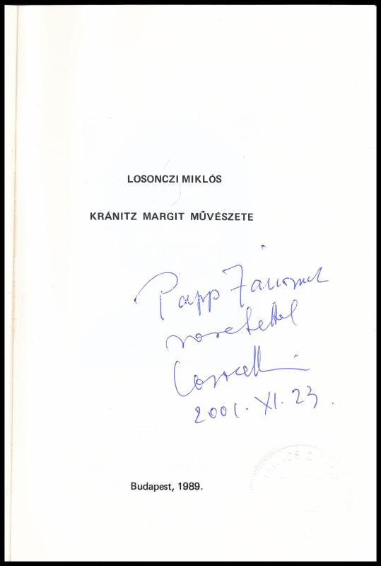 Losonczi Miklós: Kránitz Margit művészete. Bp., 1989, Budapesti Művészetbarátok Egyesülete. Kiadói papírkötés, tulajdonosi szárazbélyegzővel. A szerző által DEDIKÁLT példány.