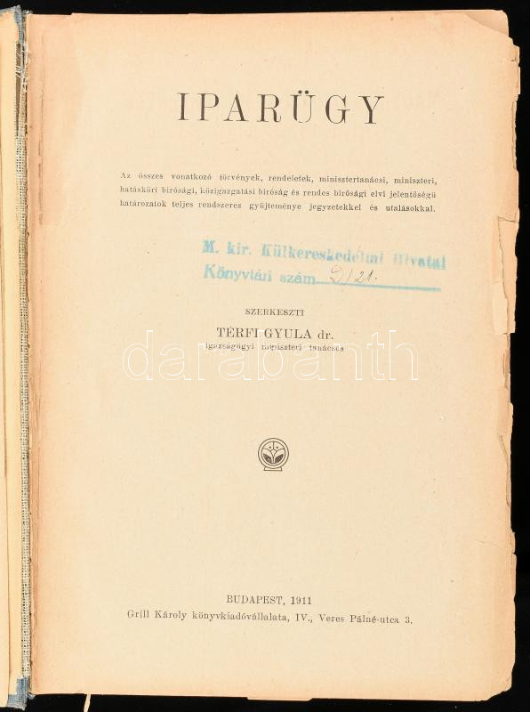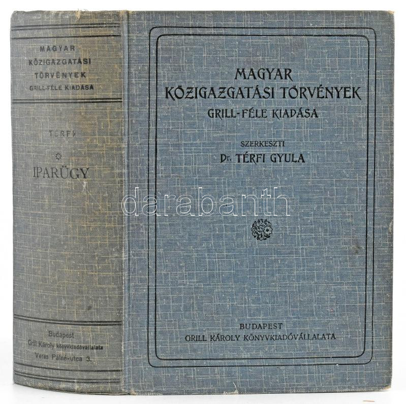 Iparügy. Szerk.: Térfi Gyula. A Magyar Közigazgatársi Törvények Grill-féle kiadása. Bp., 1911., Grill Károly, XVI+4+1170 p. Kiadói egészvászon-kötés, kissé kopott borítóval, az első 4 lap kijár és sérült.