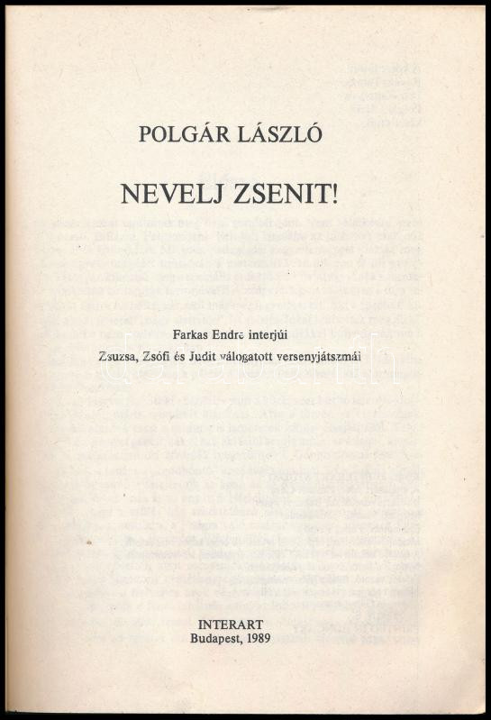 Polgár László: Nevelj zsenit! Farkas Endre interjúi Zsuzsa, Zsófi, és Judit válogatott versenyjátszmái. Szerk.: Bakonyi Péter. Bp.,1989, Interart. Fekete-fehér fotókkal illusztrált. Kiadói papÃrkötés, foltos.