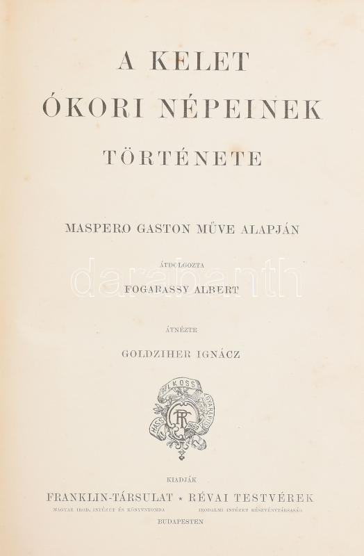 A kelet ókori népeinek története. Maspero Gaston műve alapján átdolgozta: Fogarassy Albert. Nagy Képes Világtörténet. I. köt. Szerk.: Marczali Henrik. Bp., [1891], Franklin-Révai. Szövegközi és egészoldalas fekete-fehér képekkel, kihajtható mellékletekkel. Kiadói aranyozott gerincű egészvászon-kötés, festett lapélekkel,