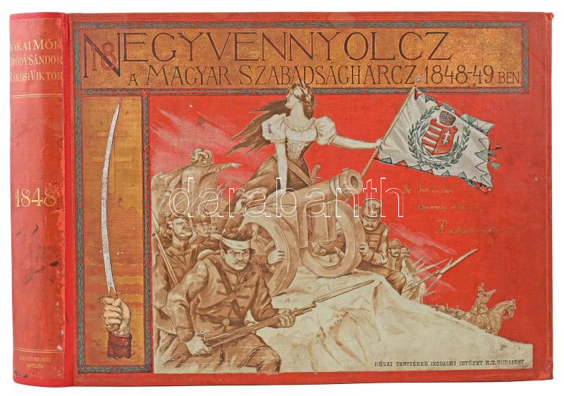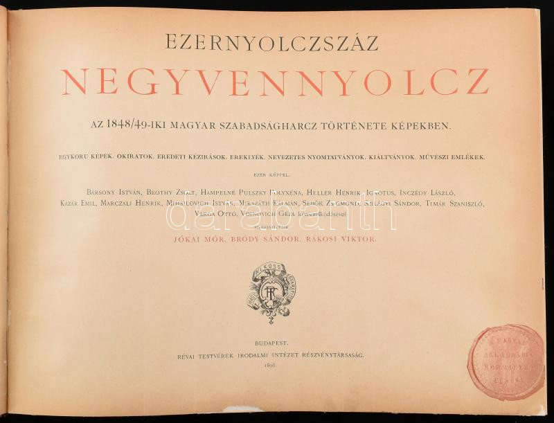 Ezernyolczszáz negyvennyolcz. Az 1848/49-iki magyar szabadságharcz története képekben. Egykorú képek, okiratok, eredeti kézírással, ereklyék, nevezetes nyomtatványok, kiáltványok, művészi emlékek. Ezer képpel. Szerk.: Jókai Mór, Bródy Sándor, Rákosi Viktor. Bp. 1898. Révai,(Franklin-Társulat-ny.), 476 p. Rendkívül gazdag egész oldalas és szövegközti képanyaggal. Kiadói festett, aranyozott, javított egészvászon-kötésben, Gottermayer-kötésben, haránt alakú, Jó példány