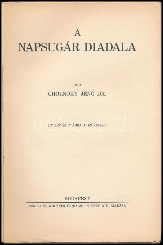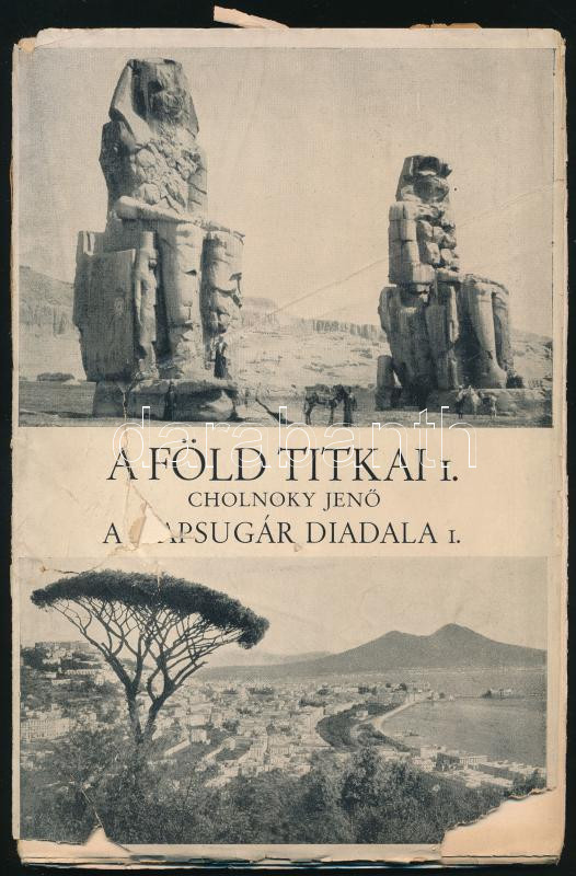 Cholnoky Jenő: A Föld titkai I. A napsugár diadala. Bp., 1930, Singer és Wolfner. Egészoldalas, fekete-fehér fotókkal illusztrált. Kiadói papírkötés, erősen sérült, szétvált borítóval. + A Föld titkai sorozatot reklámozó kiadvány
