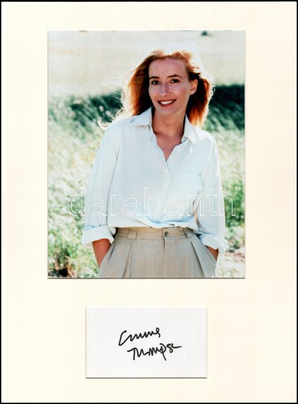 Emma Thompson (1959- ) színésznő autográf aláírása és fotója, paszpartuban, tanúsítvánnyal, teljes méret: 40x30 cm / Emma Thompson actress' autograph signature and photo, mounted, with certificate