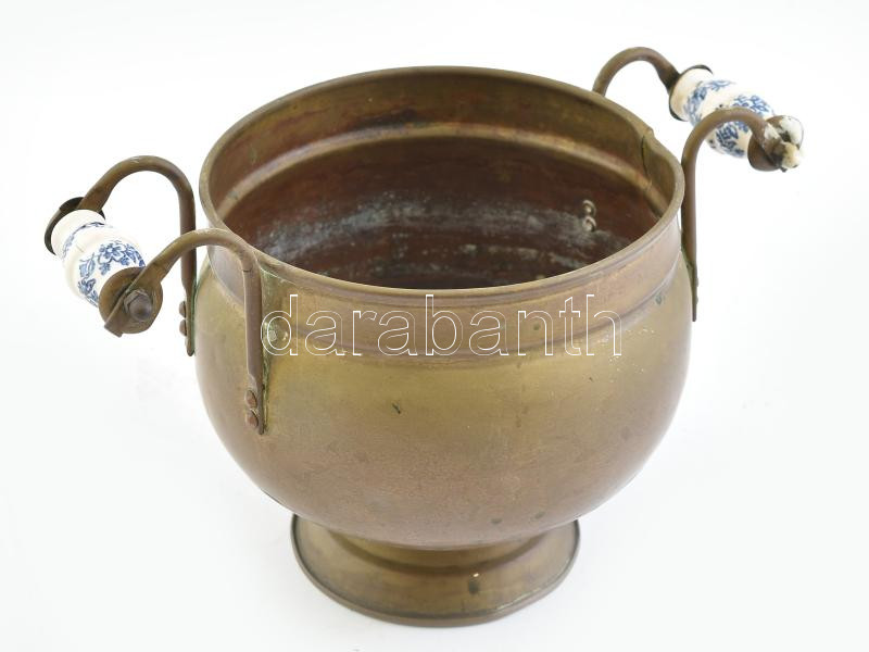 Leírás: Réz kaspó, fajansz fogantyúval, 24x15x15 cn