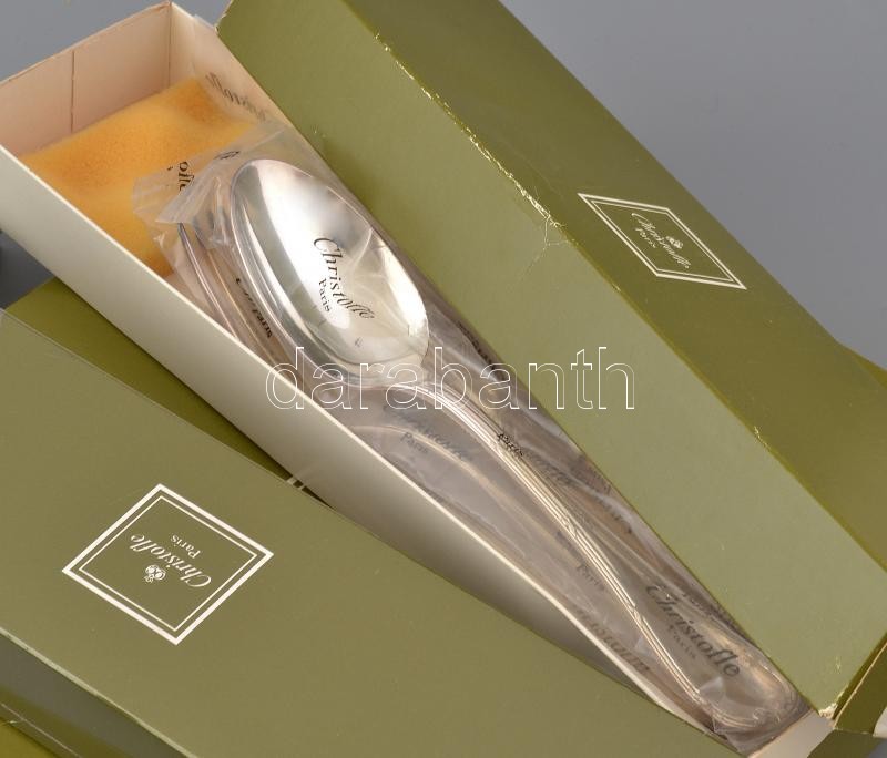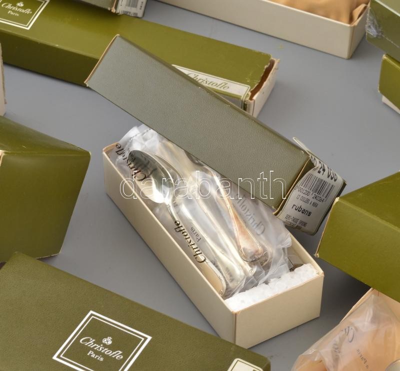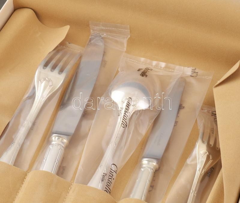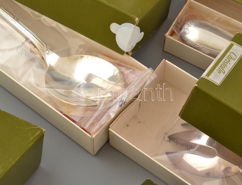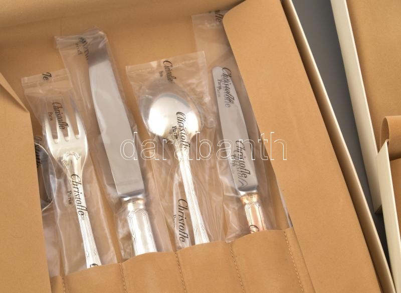 Leírás: Christofle Párizsi ezüstözött evőkészlet, vegyesen 128 db, jelzettek, nagyrészt original csomagolásban, légmentes fóliában és kartondobozokban.