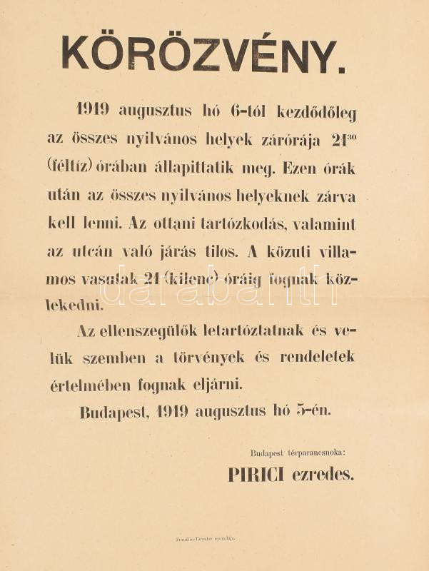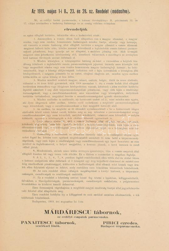 1919. augusztus 5. Magyar és román nyelvű körözvény a nyilvános helyek zárórájáról és az igazolvánnyal illetve igazolvány nélkül való közlekedésről, 3 db, szakadásokkal